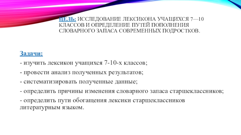 Слайд 4Цель: исследование лексикона учащихся 7—10 классов и определение путей пополнения словарного запаса современных