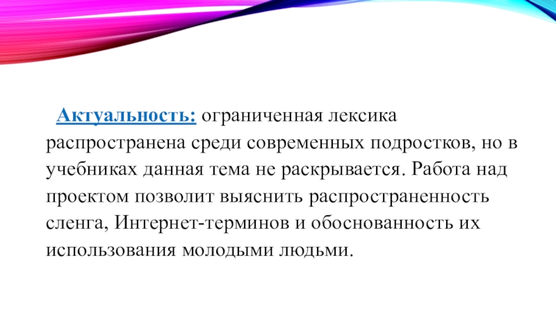 Слайд 5 Актуальность: ограниченная лексика распространена среди современных подростков, но в учебниках данная