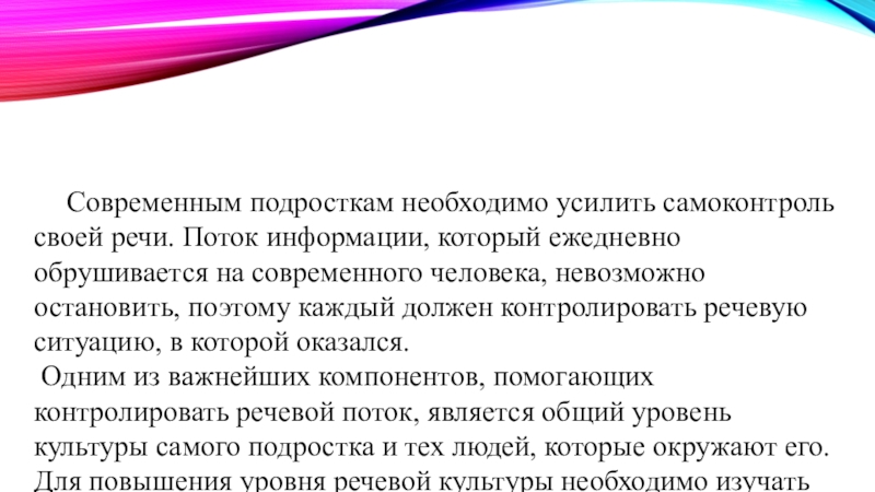 Слайд 15 Современным подросткам необходимо усилить самоконтроль своей речи. Поток информации, который ежедневно