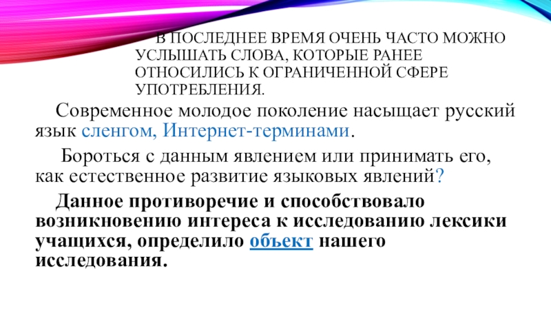 Данное противоречие и способствовало возникновению интереса к исследованию лексики учащихся, определило объект нашего исследования.