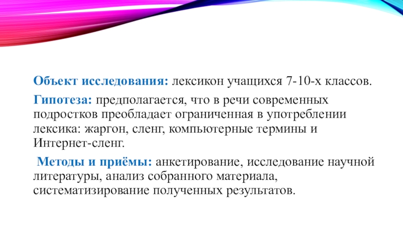 Слайд 8Объект исследования: лексикон учащихся 7-10-х классов.