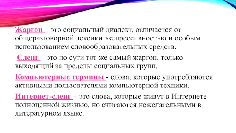 Слайд 10Жаргон – это социальный диалект, отличается от общеразговорной лексики экспрессивностью и