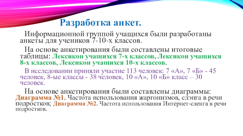 основе анкетирования были составлены итоговые таблицы: Лексикон учащихся 7-х классов, Лексикон учащихся 8-х классов, Лексикон учащихся 10-х классов.