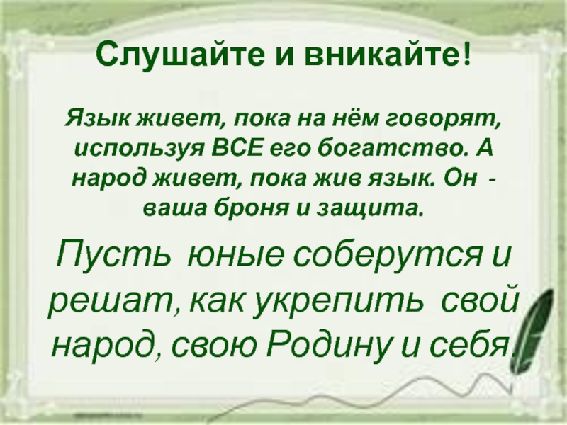 Слушайте и вникайте!Язык живет, пока на нём говорят, используя ВСЕ его богатство. А народ живет, пока жив язык. Он - ваша броня и защита. Пусть юные соберутся и решат, как укрепить свой народ, свою Родину и