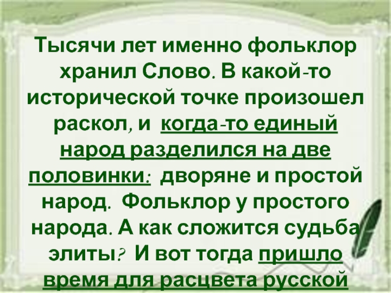 Слайд 10Тысячи лет именно фольклор хранил Слово. В какой-то исторической точке произошел