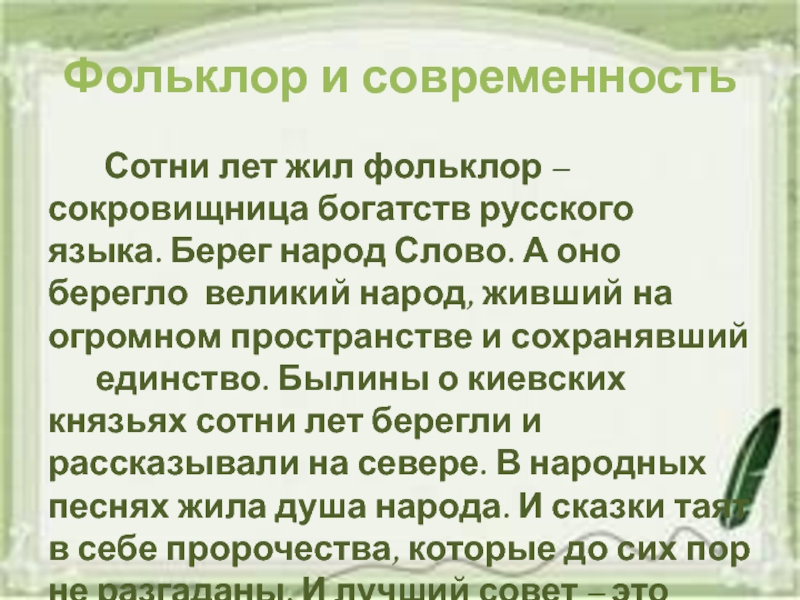сокровищница богатств русского языка. Берег народ Слово. А оно берегло великий народ, живший на огромном пространстве и сохранявший единство. Былины о киевских князьях сотни лет берегли и рассказывали на севере. В народных песнях жила душа народа. И сказки таят в себе пророчества, которые до сих пор не разгаданы. И лучший совет – это пословица.