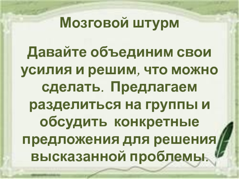 Мозговой штурмДавайте объединим свои усилия и решим, что можно сделать. Предлагаем разделиться на группы и обсудить конкретные
