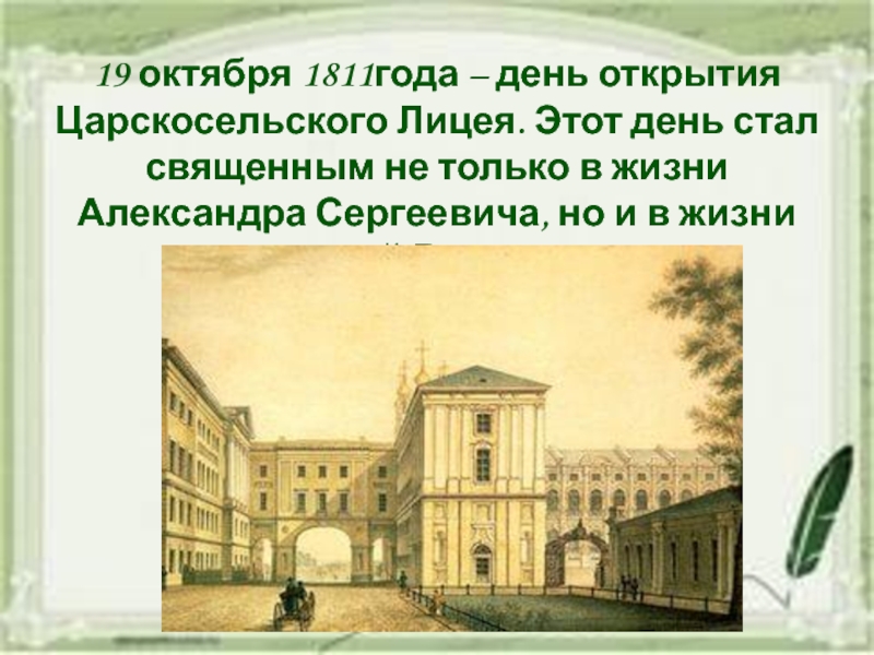 19 октября 1811года – день открытия Царскосельского Лицея. Этот день стал священным не только в жизни Александра