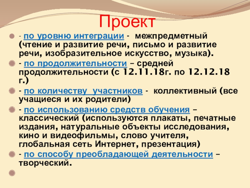 - по уровню интеграции - межпредметный (чтение и развитие речи,