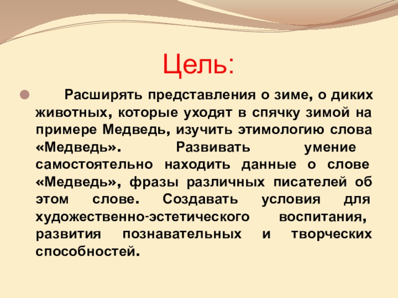 уходят в спячку зимой на примере Медведь, изучить этимологию слова «Медведь». Развивать умение самостоятельно находить данные о слове «Медведь», фразы различных писателей об этом слове. Создавать условия для художественно-эстетического воспитания, развития познавательных и творческих способностей.