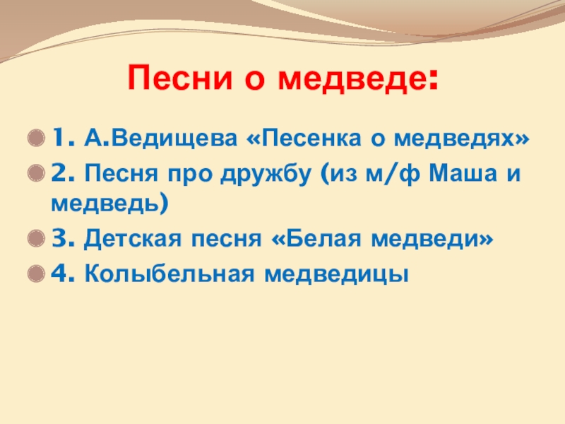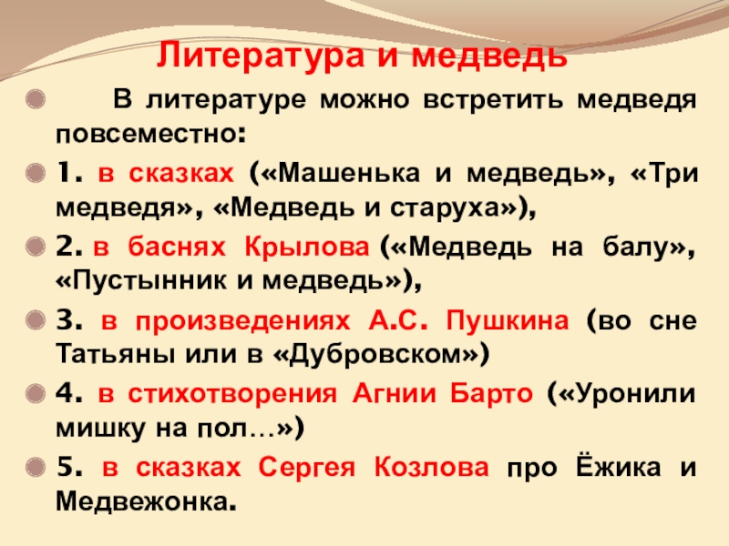 1. в сказках («Машенька и медведь», «Три медведя», «Медведь и старуха»),