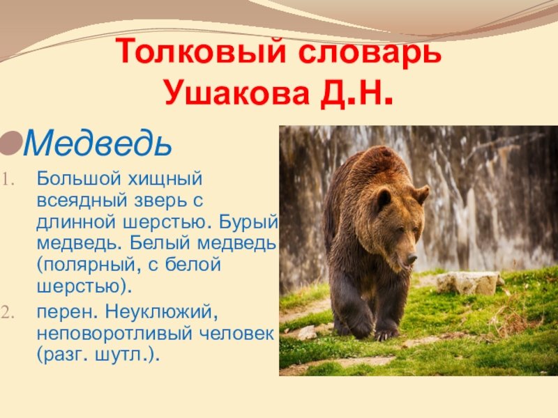 Медведь буквально — «медоед, мед едящий». Слово является сла-вянским новообразованием, сменившим ин-доевропейское название медведя.