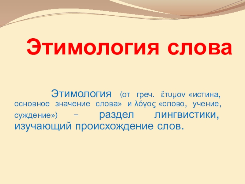 и λόγος «слово, учение, суждение») – раздел лингвистики, изучающий происхождение слов.