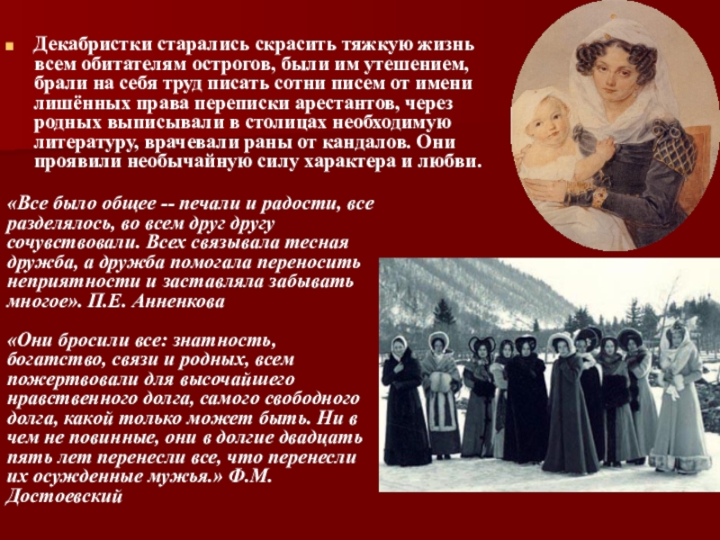 Слайд 13Декабристки старались скрасить тяжкую жизнь всем обитателям острогов, были им утешением,