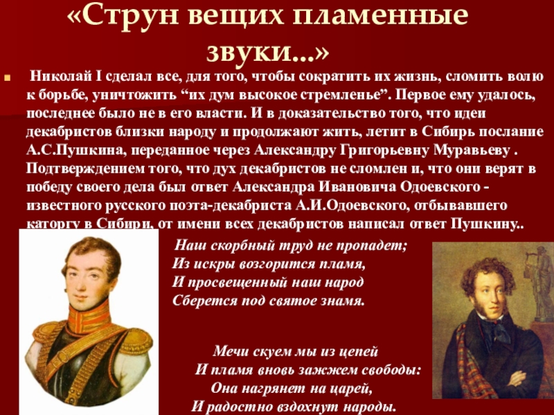 сократить их жизнь, сломить волю к борьбе, уничтожить “их дум высокое стремленье”. Первое ему удалось, последнее было не в его власти. И в доказательство того, что идеи декабристов близки народу и продолжают жить, летит в Сибирь послание А.С.Пушкина, переданное через Александру Григорьевну Муравьеву . Подтверждением того, что дух декабристов не сломлен и, что они верят в победу своего дела был ответ Александра Ивановича Одоевского - известного русского поэта-декабриста А.И.Одоевского, отбывавшего каторгу в Сибири, от имени всех декабристов написал ответ Пушкину..