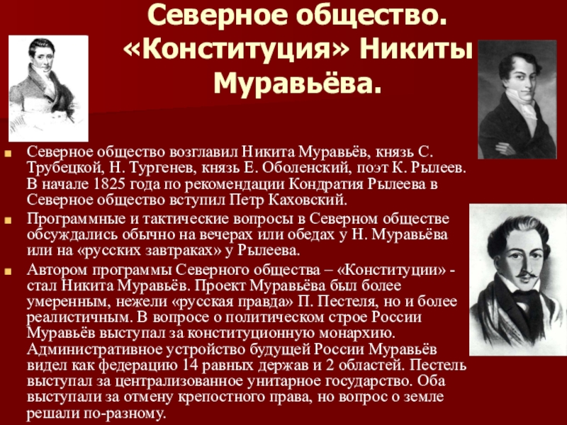 Автором программы Северного общества – «Конституции» - стал Никита Муравьёв. Проект Муравьёва был более умеренным, нежели «русская правда» П. Пестеля, но и более реалистичным. В вопросе о политическом строе России Муравьёв выступал за конституционную монархию. Административное устройство будущей России Муравьёв видел как федерацию 14 равных держав и 2 областей. Пестель выступал за централизованное унитарное государство. Оба выступали за отмену крепостного права, но вопрос о земле решали по-разному.
