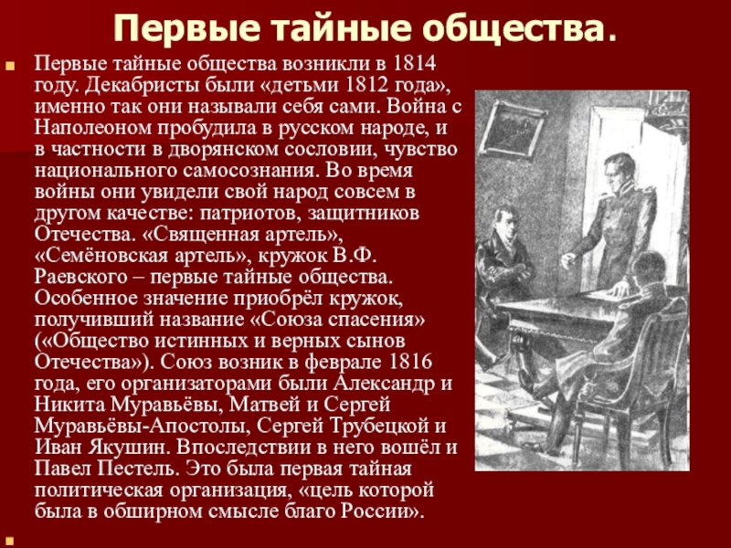были «детьми 1812 года», именно так они называли себя сами. Война с Наполеоном пробудила в русском народе, и в частности в дворянском сословии, чувство национального самосознания. Во время войны они увидели свой народ совсем в другом качестве: патриотов, защитников Отечества. «Священная артель», «Семёновская артель», кружок В.Ф. Раевского – первые тайные общества. Особенное значение приобрёл кружок, получивший название «Союза спасения» («Общество истинных и верных сынов Отечества»). Союз возник в феврале 1816 года, его организаторами были Александр и Никита Муравьёвы, Матвей и Сергей Муравьёвы-Апостолы, Сергей Трубецкой и Иван Якушин. Впоследствии в него вошёл и Павел Пестель. Это была первая тайная политическая организация, «цель которой была в обширном смысле благо России».