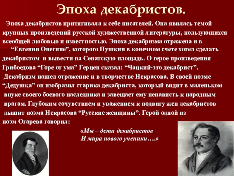 Декабризм нашел отражение и в творчестве Некрасова. В своей поэме