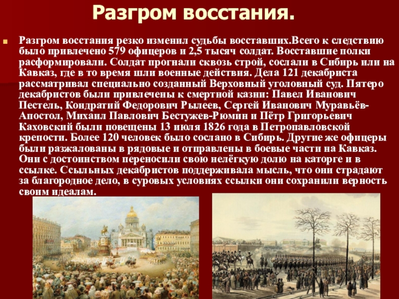 579 офицеров и 2,5 тысяч солдат. Восставшие полки расформировали. Солдат прогнали сквозь строй, сослали в Сибирь или на Кавказ, где в то время шли военные действия. Дела 121 декабриста рассматривал специально созданный Верховный уголовный суд. Пятеро декабристов были привлечены к смертной казни: Павел Иванович Пестель, Кондратий Федорович Рылеев, Сергей Иванович Муравьёв-Апостол, Михаил Павлович Бестужев-Рюмин и Пётр Григорьевич Каховский были повещены 13 июля 1826 года в Петропавловской крепости. Более 120 человек было сослано в Сибирь. Другие же офицеры были разжалованы в рядовые и отправлены в боевые части на Кавказ. Они с достоинством переносили свою нелёгкую долю на каторге и в ссылке. Ссыльных декабристов поддерживала мысль, что они страдают за благородное дело, в суровых условиях ссылки они сохранили верность своим идеалам.