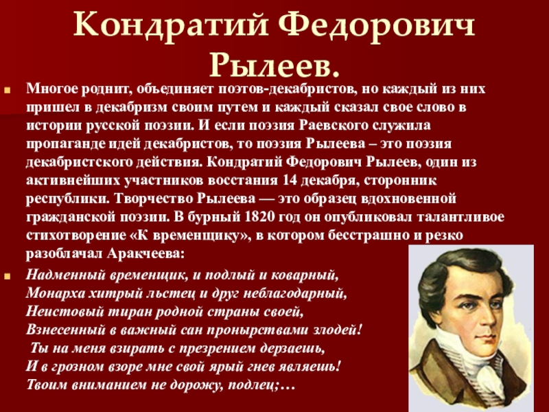 своим путем и каждый сказал свое слово в истории русской поэзии. И если поэзия Раевского служила пропаганде идей декабристов, то поэзия Рылеева – это поэзия декабристского действия. Кондратий Федорович Рылеев, один из активнейших участников восстания 14 декабря, сторонник республики. Творчество Рылеева — это образец вдохновенной гражданской поэзии. В бурный 1820 год он опубликовал талантливое стихотворение «К временщику», в котором бесстрашно и резко разоблачал Аракчеева: