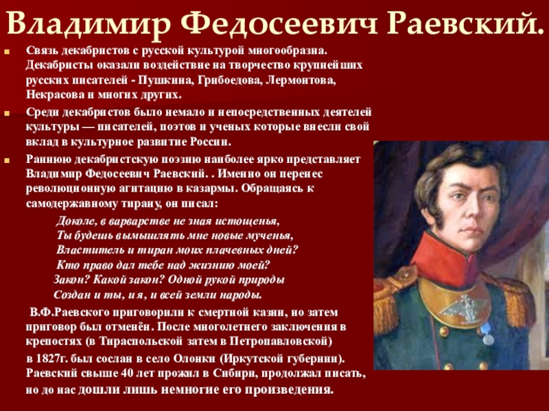 Раннюю декабристскую поэзию наиболее ярко представляет Владимир Федосеевич Раевский. . Именно он перенес революционную агитацию в казармы. Обращаясь к самодержавному тирану, он писал: