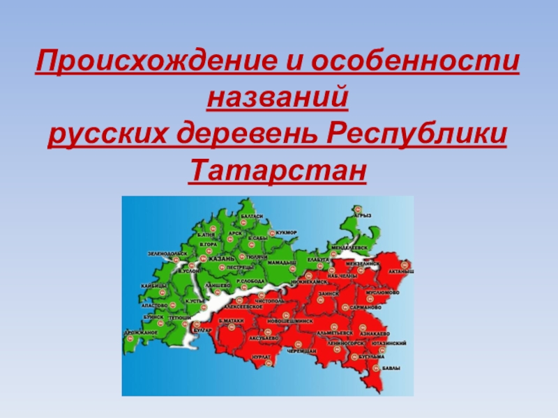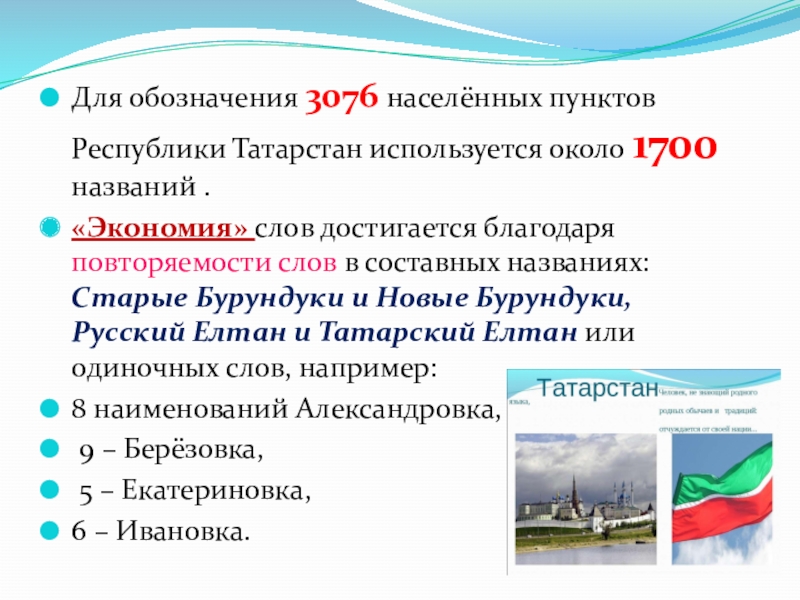 Слайд 10Для обозначения 3076 населённых пунктов Республики Татарстан используется около 1700 названий