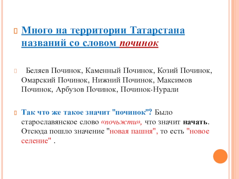 Так что же такое значит "починок"? Было старославянское слово «почьжти», что значит начать. Отсюда пошло значение "новая пашня", то есть "новое селение" .