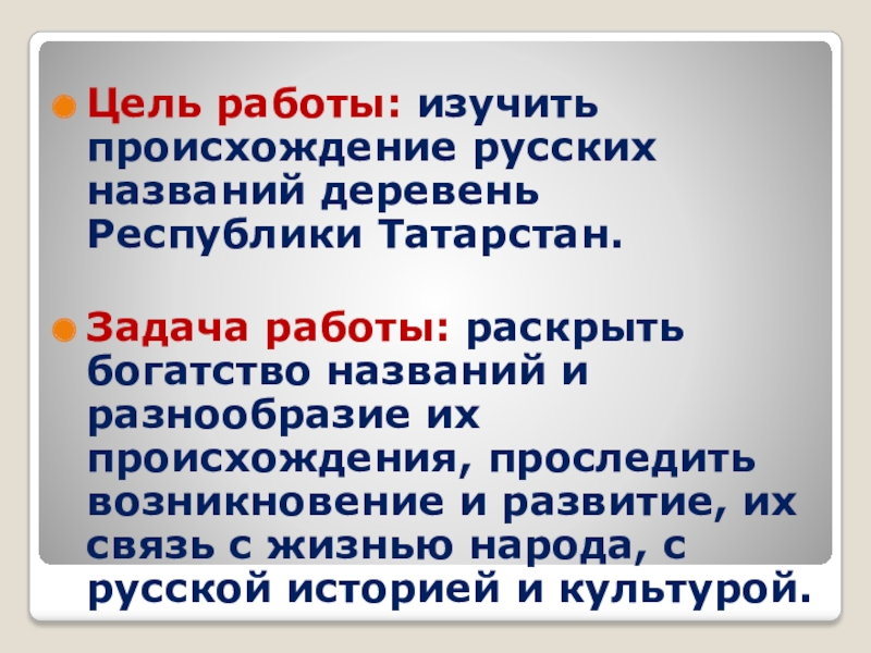 Слайд 4Цель работы: изучить происхождение русских названий деревень Республики Татарстан.