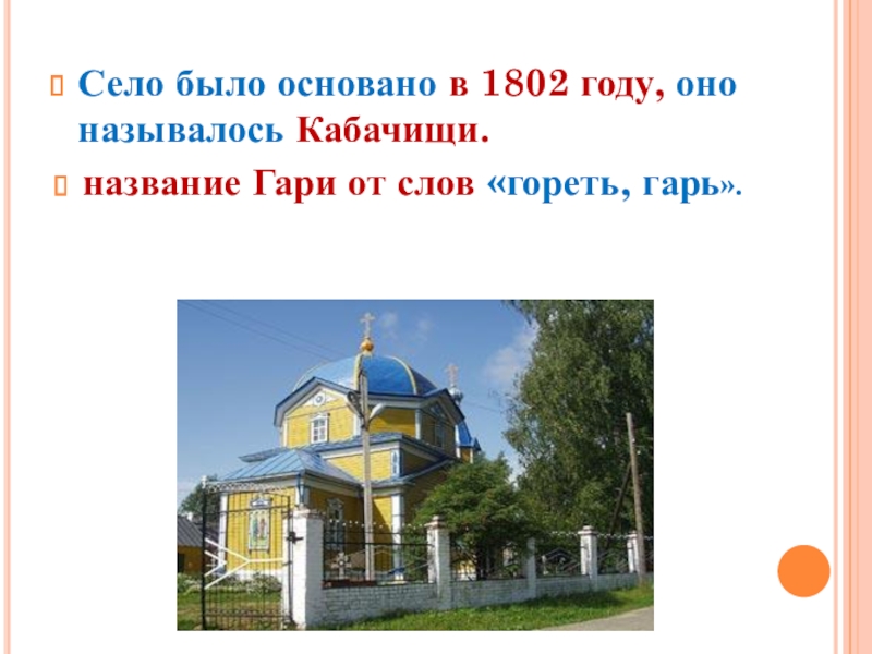 Слайд 19Село было основано в 1802 году, оно называлось Кабачищи.