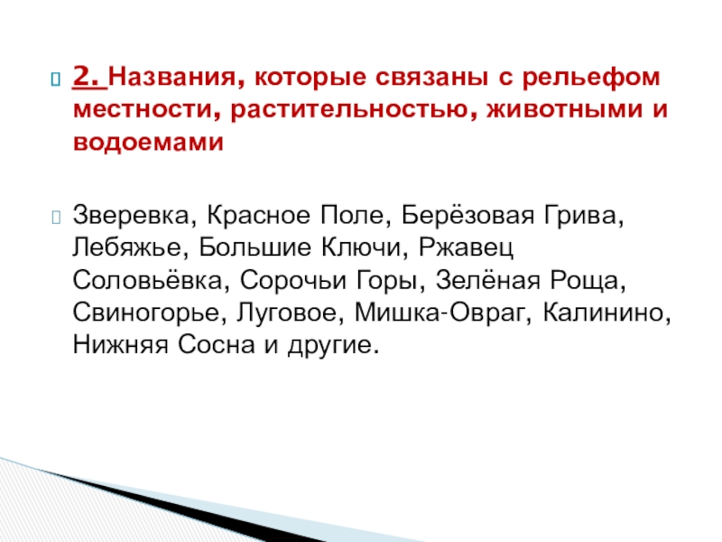 Слайд 132. Названия, которые связаны с рельефом местности, растительностью, животными и водоемами