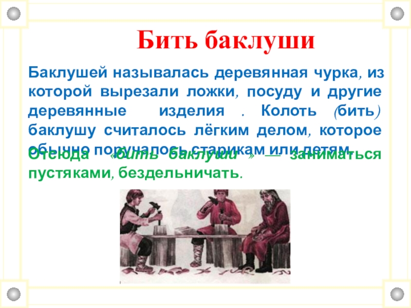 Отсюда «бить баклуши » — заниматься пустяками, бездельничать.