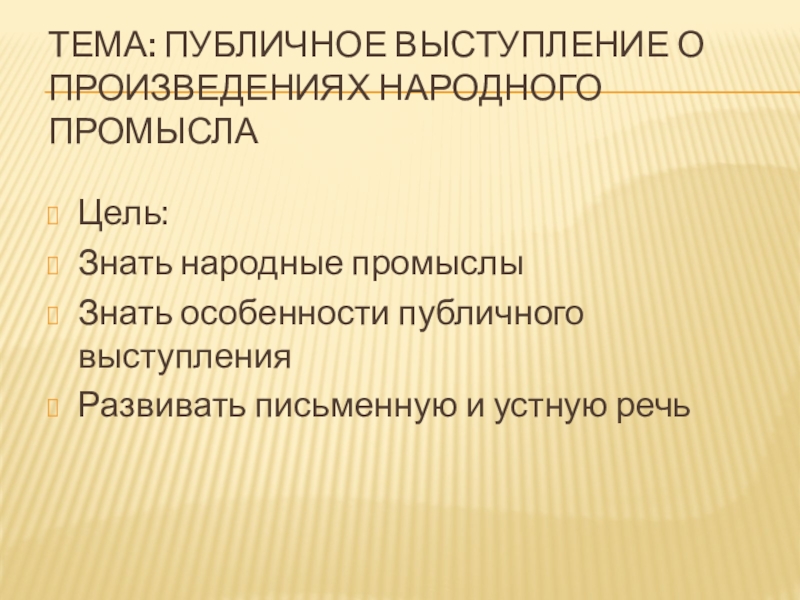 Тема: Публичное выступление о произведениях народного промыслаЦель:Знать народные промыслыЗнать особенности публичного выступленияРазвивать письменную и устную речь