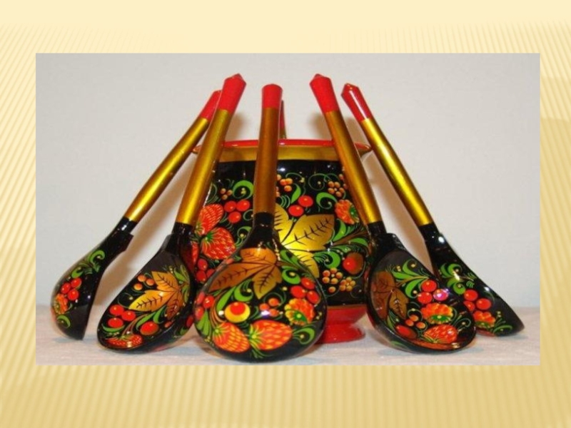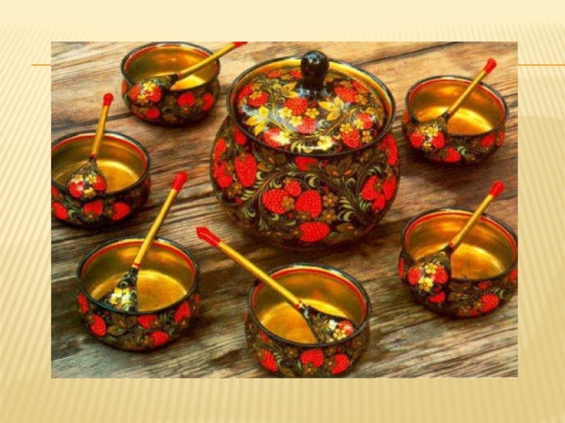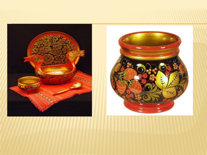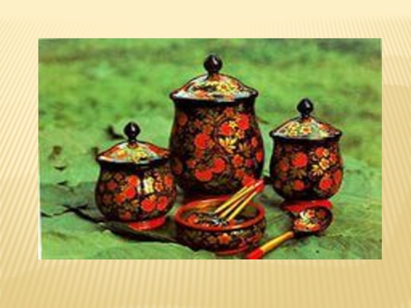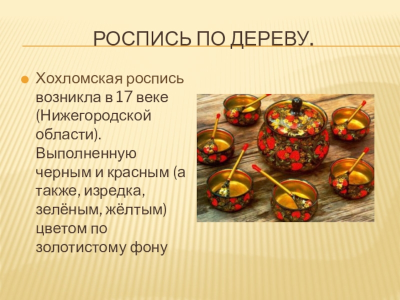 Роспись по дереву.Хохломская роспись возникла в 17 веке (Нижегородской области). Выполненную черным и красным (а также, изредка,