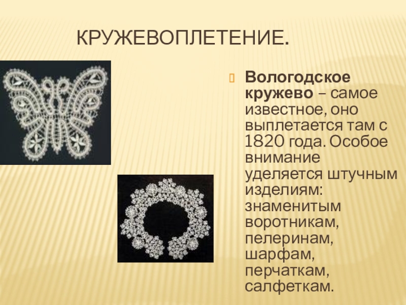 Кружевоплетение.Вологодское кружево – самое известное, оно выплетается там с 1820 года. Особое внимание уделяется штучным изделиям: знаменитым