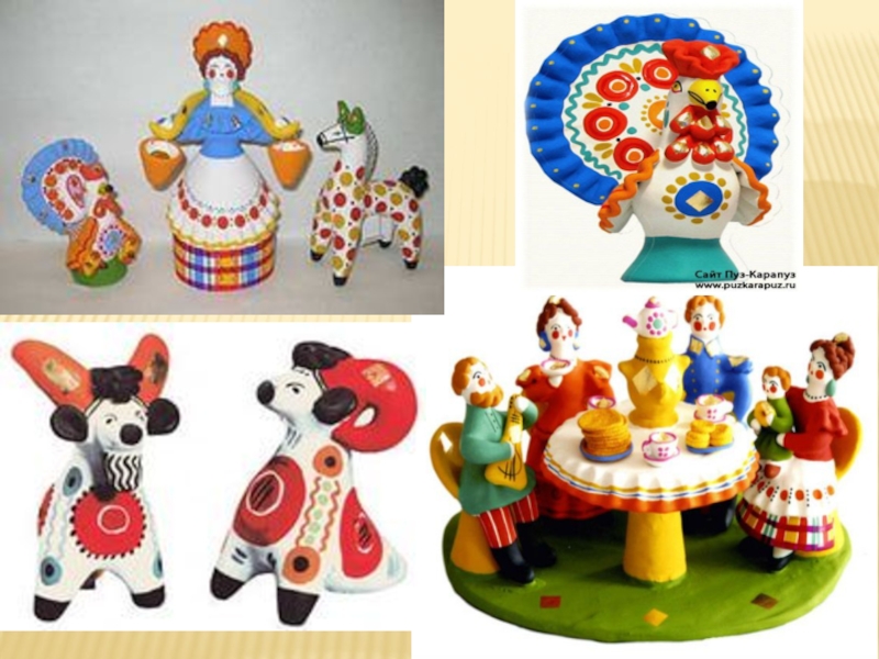 изделий мастериц составляют традиционные свистульки: барыни, всадники, коровы, медведи, петухи.
