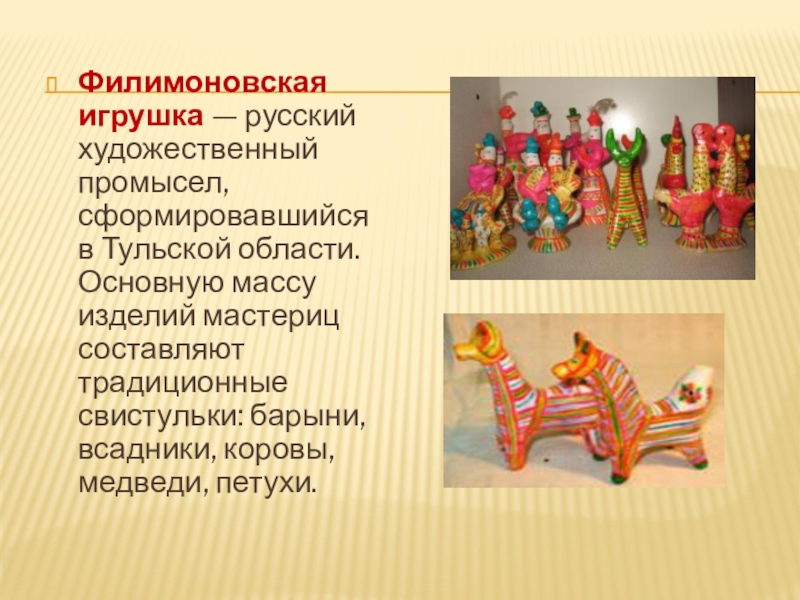 Слайд 20Филимоновская игрушка — русский художественный промысел, сформировавшийся в Тульской области. Основную массу