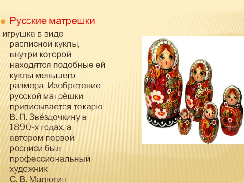 куклы меньшего размера. Изобретение русской матрёшки приписывается токарю В. П. Звёздочкину в 1890-х годах, а автором первой росписи был профессиональный художник С. В. Малютин
