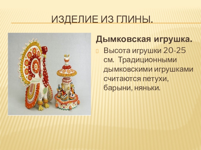 Изделие из глины.Дымковская игрушка. Высота игрушки 20-25 см. Традиционными дымковскими игрушками считаются петухи, барыни, няньки.