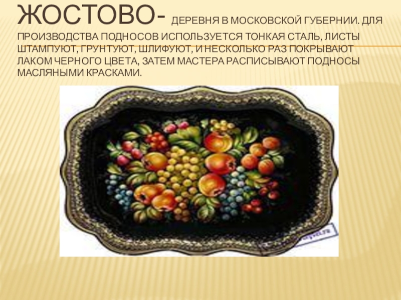 Слайд 17Жостово- деревня в Московской губернии. Для производства подносов используется тонкая сталь,