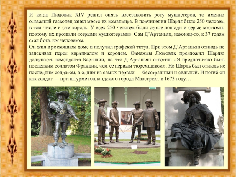 Слайд 16И когда Людовик XIV решил опять восстановить роту мушкетеров, то именно