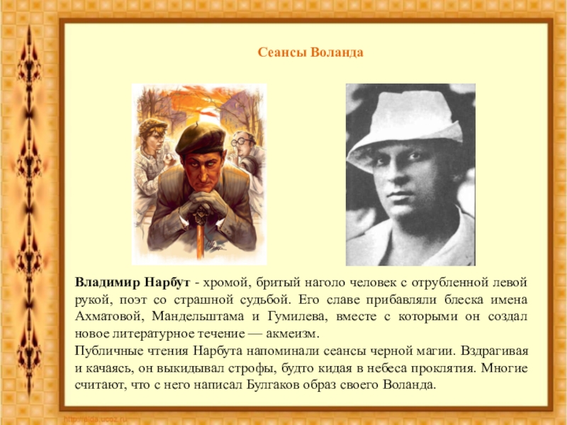 Публичные чтения Нарбута напоминали сеансы черной магии. Вздрагивая и качаясь, он выкидывал строфы, будто кидая в небеса проклятия. Многие считают, что с него написал Булгаков образ своего Воланда.