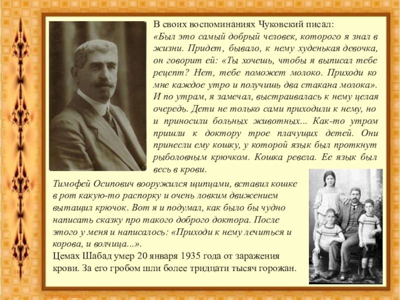 «Был это самый добрый человек, которого я знал в жизни. Придет, бывало, к нему худенькая девочка, он говорит ей: «Ты хочешь, чтобы я выписал тебе рецепт? Нет, тебе поможет молоко. Приходи ко мне каждое утро и получишь два стакана молока». И по утрам, я замечал, выстраивалась к нему целая очередь. Дети не только сами приходили к нему, но и приносили больных животных... Как-то утром пришли к доктору трое плачущих детей. Они принесли ему кошку, у которой язык был проткнут рыболовным крючком. Кошка ревела. Ее язык был весь в крови.