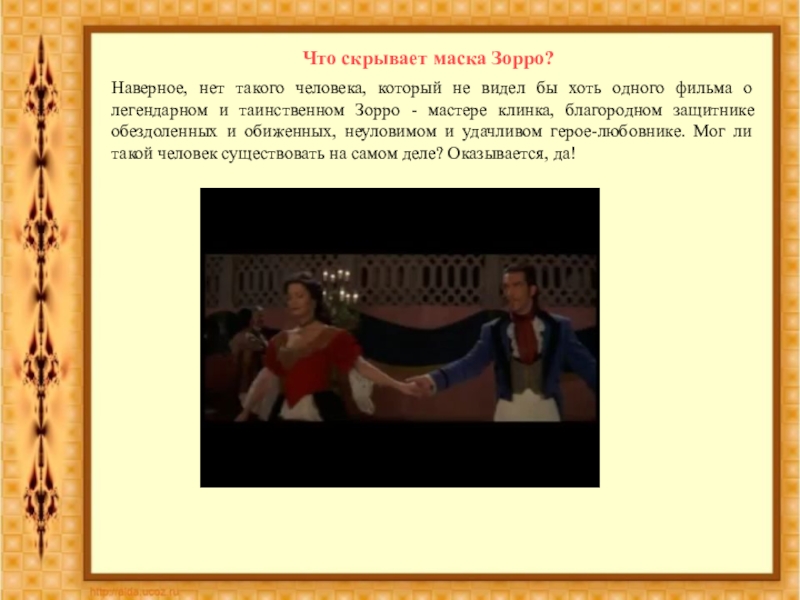 хоть одного фильма о легендарном и таинственном Зорро - мастере клинка, благородном защитнике обездоленных и обиженных, неуловимом и удачливом герое-любовнике. Мог ли такой человек существовать на самом деле? Оказывается, да!