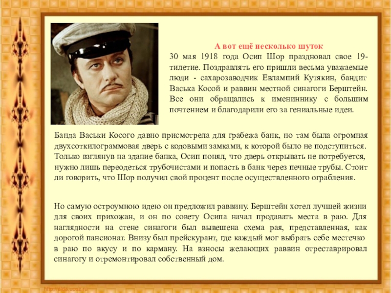 свое 19-тилетие. Поздравлять его пришли весьма уважаемые люди - сахарозаводчик Евлампий Кутякин, бандит Васька Косой и раввин местной синагоги Берштейн. Все они обращались к имениннику с большим почтением и благодарили его за гениальные идеи.