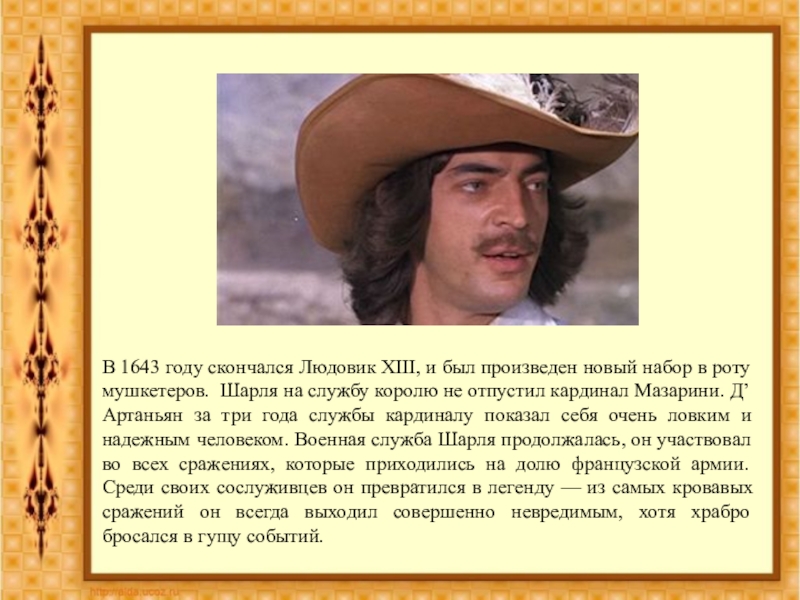 Слайд 13Прототип главного героя знаменитых «Трех мушкетеров» появился на свет в Гаскони,