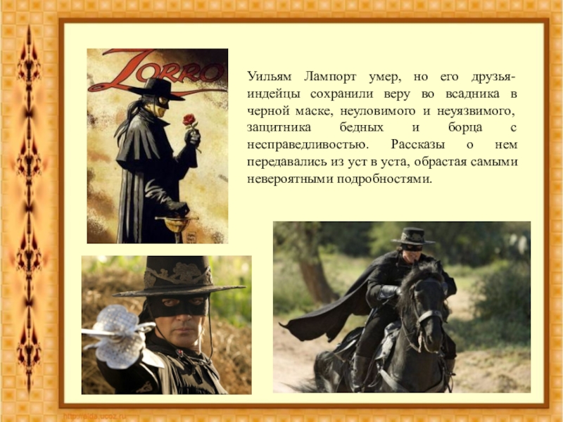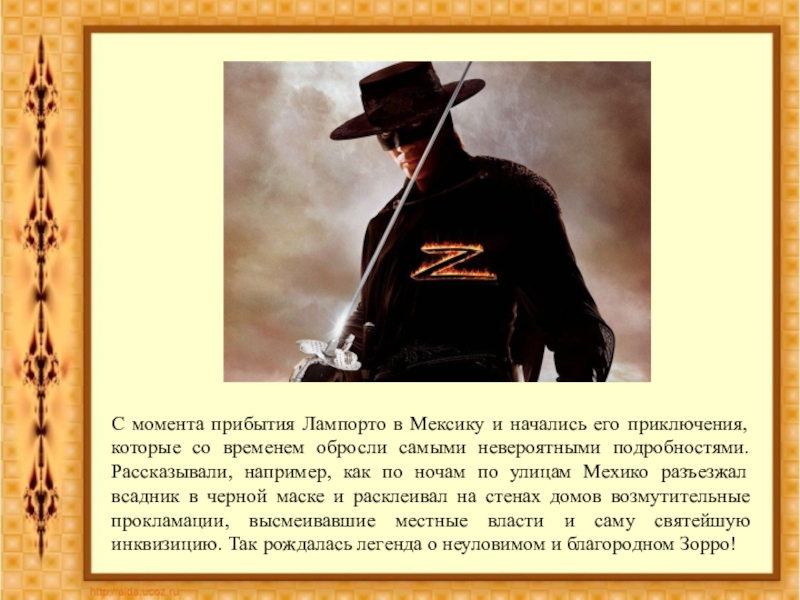 со временем обросли самыми невероятными подробностями. Рассказывали, например, как по ночам по улицам Мехико разъезжал всадник в черной маске и расклеивал на стенах домов возмутительные прокламации, высмеивавшие местные власти и саму святейшую инквизицию. Так рождалась легенда о неуловимом и благородном Зорро!
