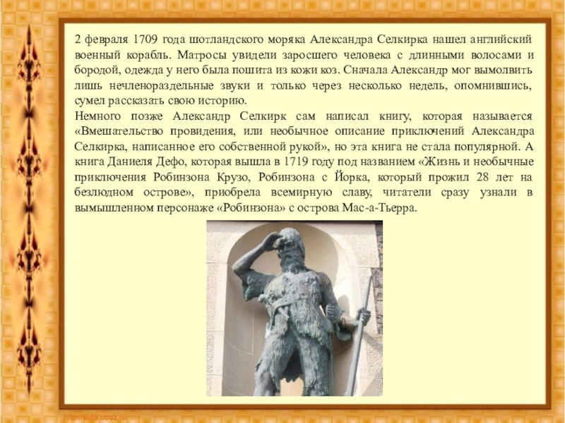 Слайд 122 февраля 1709 года шотландского моряка Александра Селкирка нашел английский военный