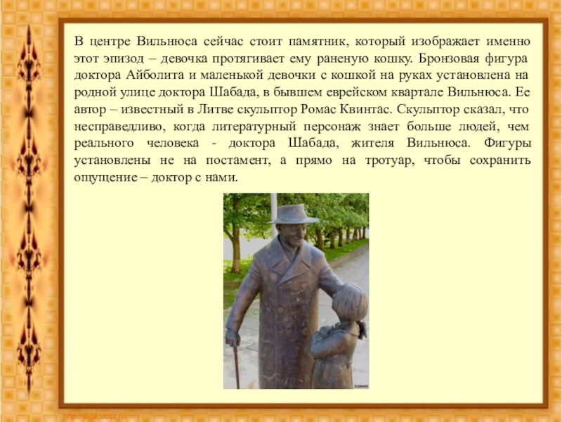 – девочка протягивает ему раненую кошку. Бронзовая фигура доктора Айболита и маленькой девочки с кошкой на руках установлена на родной улице доктора Шабада, в бывшем еврейском квартале Вильнюса. Ее автор – известный в Литве скульптор Ромас Квинтас. Скульптор сказал, что несправедливо, когда литературный персонаж знает больше людей, чем реального человека - доктора Шабада, жителя Вильнюса. Фигуры установлены не на постамент, а прямо на тротуар, чтобы сохранить ощущение – доктор с нами.
