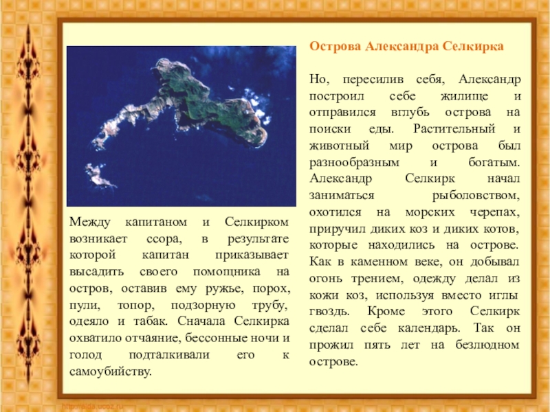 высадить своего помощника на остров, оставив ему ружье, порох, пули, топор, подзорную трубу, одеяло и табак. Сначала Селкирка охватило отчаяние, бессонные ночи и голод подталкивали его к самоубийству.