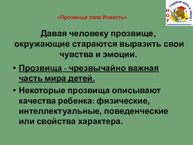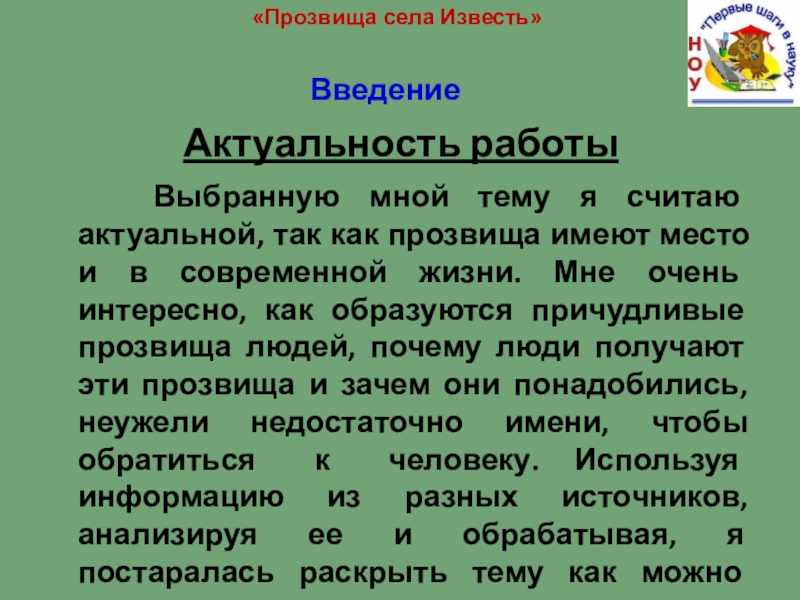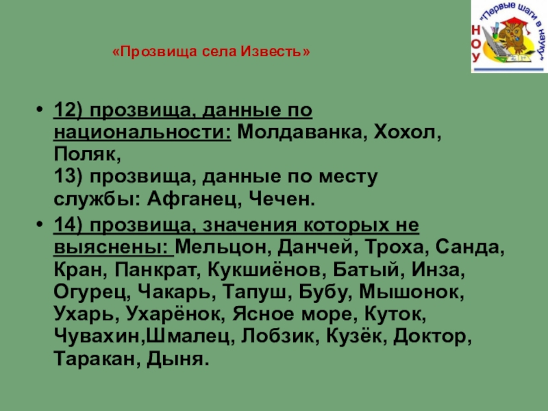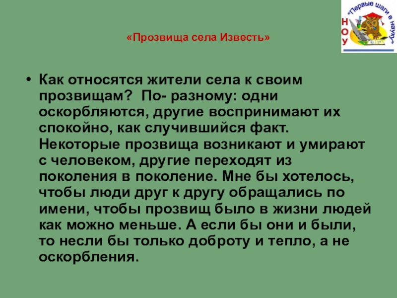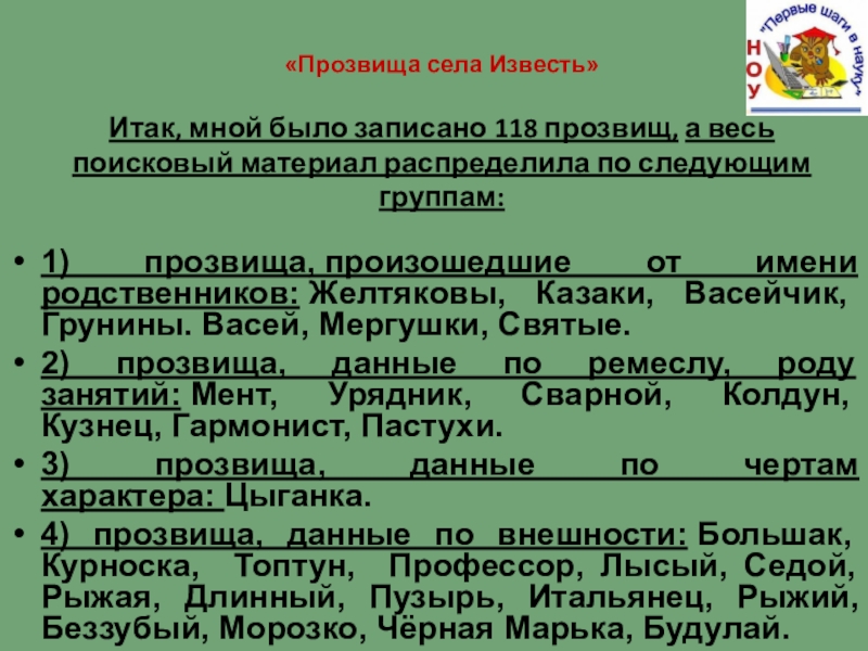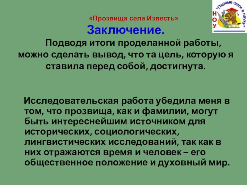 Исследовательская работа убедила меня в том, что прозвища, как и фамилии, могут быть интереснейшим источником для исторических, социологических, лингвистических исследований, так как в них отражаются время и человек – его общественное положение и духовный мир.